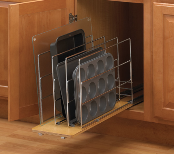 organization for convenient storage for a variety of kitchen utensils and small appliances. Just over 50% of homeowners choose organizers integrated into their cabinetry for cookie sheets and other infrequently used utensils, while a much larger majority add pullouts for waste and recycling or pet food, etc. Some of the optional convenience storage is being provided for items such as storage spices, cutlery, utensils, pots and pans and small appliances. Many go with specialty storage solutions like deep drawers, Lazy Susans', pullouts or swingouts and corner pullouts, as well.